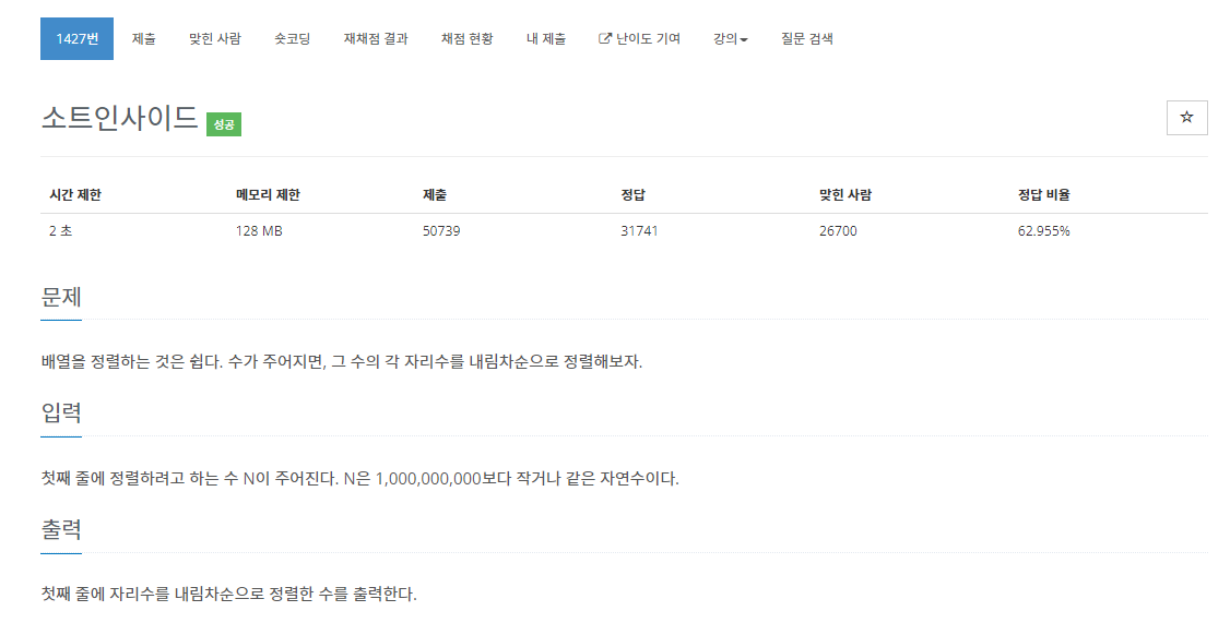 배열을 정렬하는 것은 쉽다. 수가 주어지면, 그 수의 각 자리수를 내림차순으로 정렬해보자.