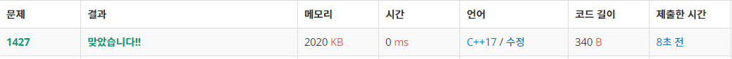 따라서 문제가 원하는 답인 각 자리의 숫자를 내림차순으로 출력할 수 있다.