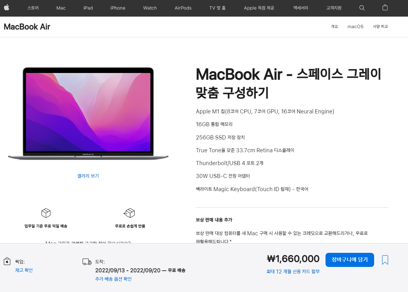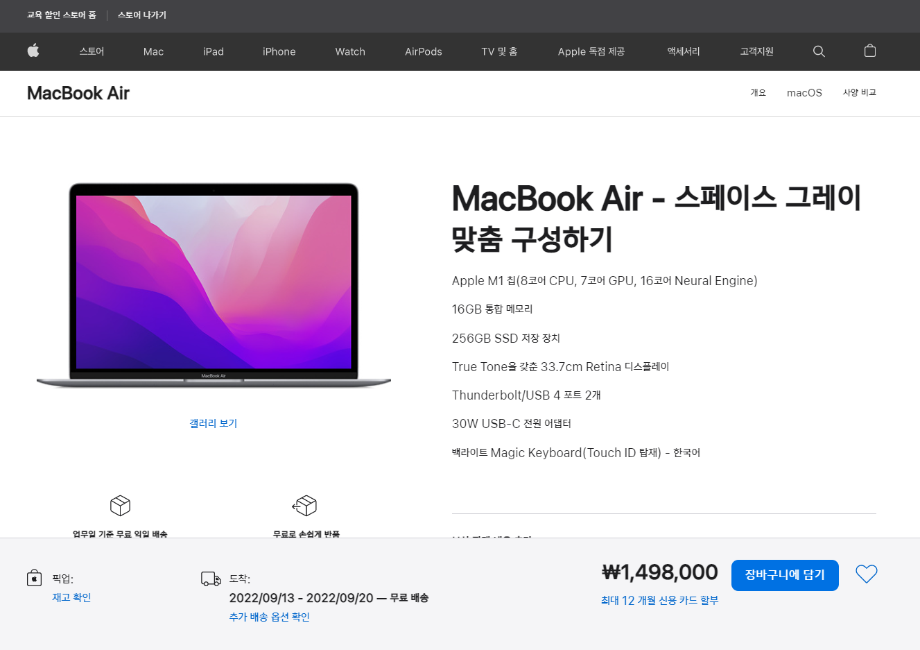 위 사진이 일반 공식 사이트에서 맥북 에어 M1칩 RAM 16GB의 가격이다.
