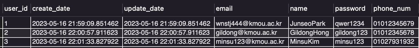 해당 테이블에서 직접 설정해준 'create_date' 와 'update_date' 컬럼이 잘 생성 되었다.