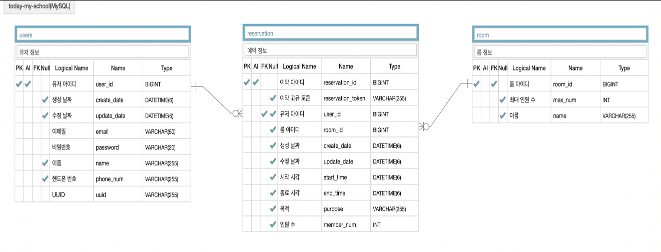 - FK값으로 'user_id' 와 'room_id' 가 있다. 위에서 말했듯 예약 엔티티는 유저와 룸 엔티티와 각각 1:N, N:1 관계로, 서로 연관되어있다. 따라서 예약 정보엔 누가 예약했는지, 어느 시설물을 예약했는지 알 수 있는 FK값이 필요하다.