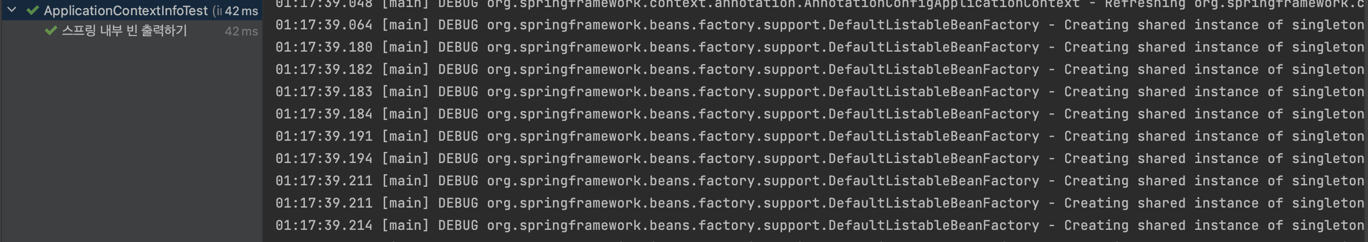 결과 뒤쪽에 "Creating shared instance of singleton .." 의 의미는 각 빈들이 싱글톤 객체로 관리된다는 뜻이다.