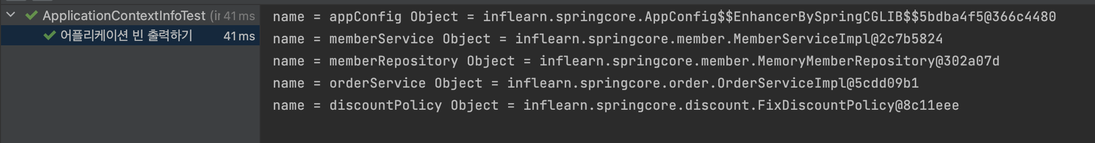 - 향상된 for 문 : beanDefinitionNames 배열을 순회하며 차례대로 등록된 모든 bean 이름을 가져온다.