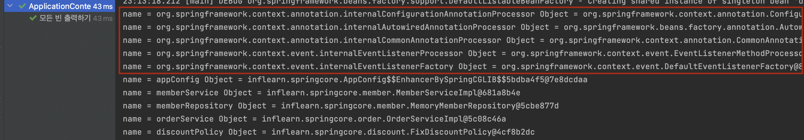 빨간 박스 내부에 있는 결과가 스프링 내부적으로 생성된 빈들이다.