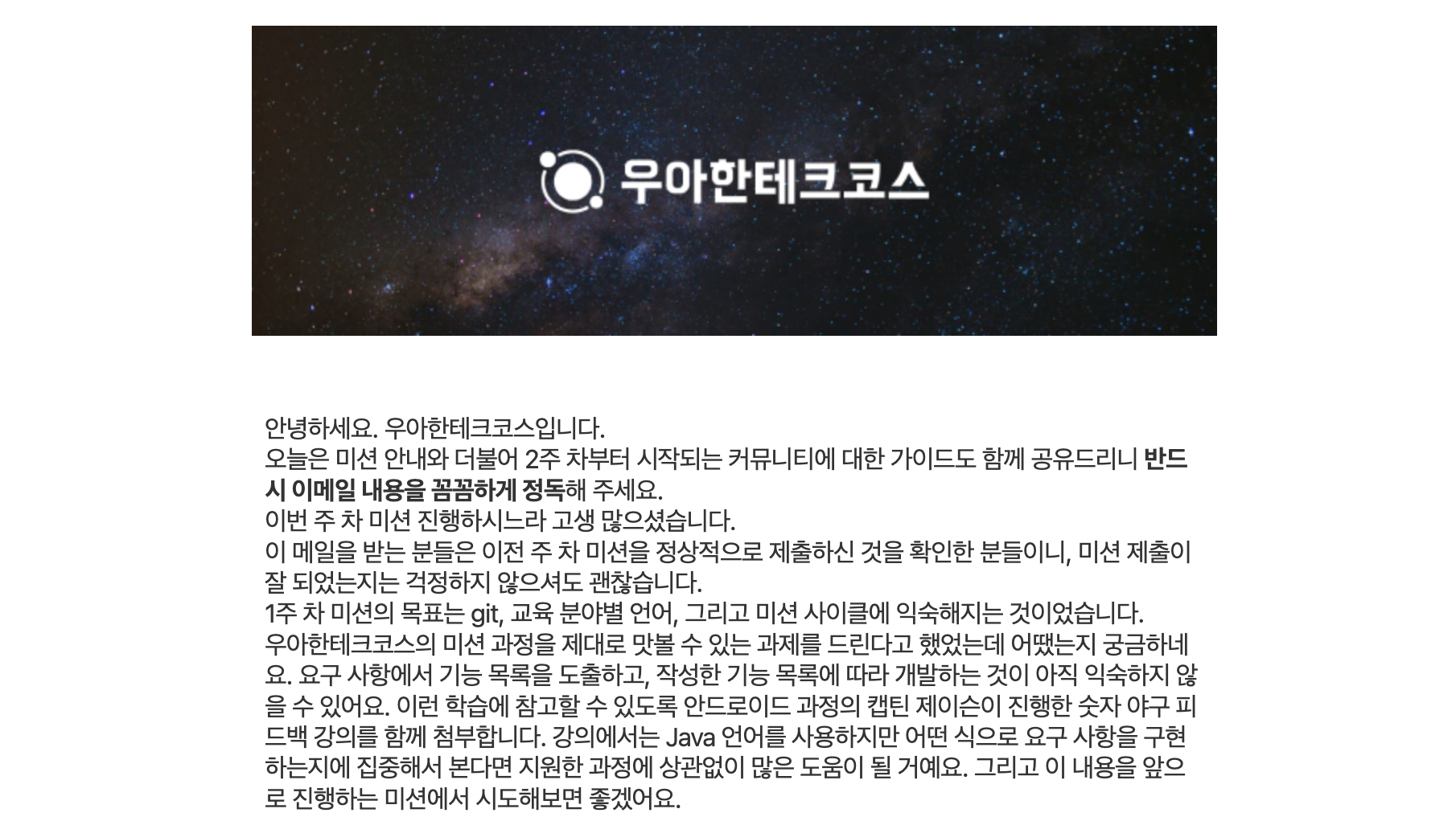 1주 차의 목표는 git, Java, 미션 사이클에 익숙해지는 것이었다. 또한 요구 사항을 통해 기능 목록을 도출하고, 작성한 목록에 따라 개발하는 연습을 했다. 처음엔 기능 목록을 어떻게 작성해야 할지, 어떤 내용을 넣어야 할지 고민하느라 많은 시간이 걸렸다. 실제로 기능 요구 사항에 명시되어 있지 않은 내용은 스스로 판단하여 작성했다. 예를 들어 자동차의 이름, 최대 자동차 수, 최대 게임 수 등을 제한하여 기능 목록을 차근차근 작성해 나갔다.