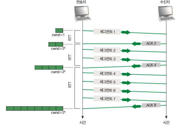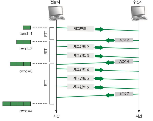 느린 시작은 초기에 전송되는 패킷의 수를 제한하고, 네트워크 혼잡 상태를 파악하기 위해 전송할 때마다 윈도우 크기를 지수적으로 증가시키는 방법이다. 이는 AIMD처럼 패킷을 하나씩 보내면서 시작한다. 패킷이 문제 없이 전송되면 각 ACK 패킷마다 윈도우 크기를 1씩 증가시킨다. 한 주기가 지나면 윈도우 크기는 2배가 된다. 즉, 윈도우 크기를 한계치에 도달할 때까지 1, 2, 4, 8, 16, ... 처럼 지수적으로 증가시키다가 혼잡이 감지되면 윈도우 크기를 1로 줄이는 방식이다. 말 그대로 느리게 출발해 점점 증가 속도가 빨라진다.