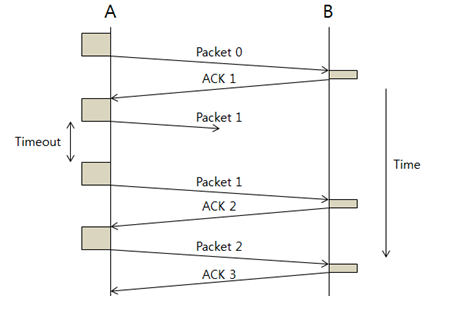 - 송신 측은 데이터를 전송할 때마다 수신 측으로부터 확인 메시지인 ACK를 기다린다.