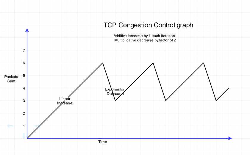 - 가산적 증가 (Additive Increase) : 송신 측은 네트워크에서 패킷이 성공적으로 전송될 때마다 윈도우 크기를 1씩 증가시킨다. 이는 선형적인 증가로 이루어지며, 네트워크의 사용 가능한 대역폭을 효과적으로 활용하기 위해 시도한다.