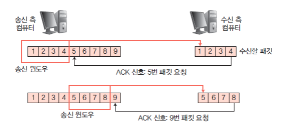 예를 들어 송신 측 컴퓨터에서 한 번에 전송할 송신 윈도우 크기가 패킷 4개의 크기라고 하자. 송신 측은 윈도우 크기에 따라 1~4번 패킷을 전송하고, 수신 측에서 수신 확인 ACK 신호를 수신하면 ACK 신호에서 요청한 5번 패킷 위치로 송신 윈도우를 옮긴다. 다시 윈도우 안의 패킷을 전송하고, 수신 측에서 ACK 신호를 수신하면 ACK 신호에서 요청한 9번 패킷 위치로 송신 윈도우를 옮긴다. 다음의 단계로 일반화할 수 있다.
