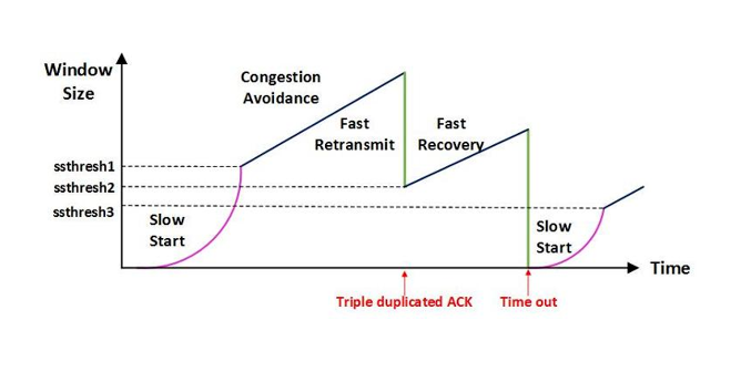 - 곱셈적 감소 (Multiplicative Decrease) : 혼잡을 감지한 경우, 송신 측은 윈도우 크기를 반으로 줄인다. 이는 혼잡 상태에서 전송 속도를 급격히 감소히켜 혼잡을 완화한다. 이는 '혼잡 회피'와 조합되어 사용된다.