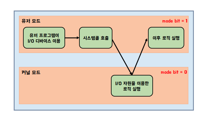가령 I/O 디바이스를 다루는 프로그램을 실행할 때 다음과 같은 로직을 거치게 된다.