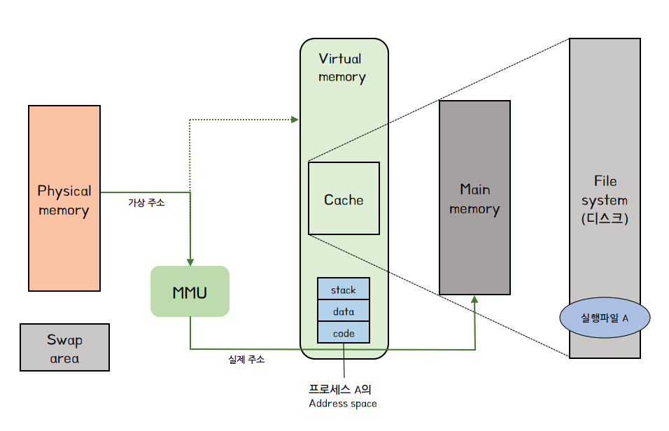 이러한 독자적인 주소 공간을 '물리적 메모리(Physical memory)'에 올려 실행을 시킨다. 이 때 커널 영역은 컴퓨터를 켜면 메모리에 항상 올라가있지만, 사용자 프로그램은 실행을 할 때 주소 공간이 생겼다가 프로그램을 종료하면 사라진다. 또한 모든 주소 공간을 물리적 메모리에 올리는 것이 아니라 필요한 부분만 올려 메모리 낭비를 방지한다. 경우에 따라 보관해야 하는 주소 공간 중 당장 필요한 것은 물리적 메모리에 올려놓고, 그렇지 않은 것은 'Swap area'에 내려놓는다. 가상 메모리의 stack, data, code는 각각 분리되어 용도에 맞게 메모리에 올라간다.
