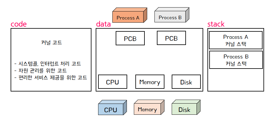 운영체제의 코드는 여러 프로그램들의 요청에 따라 사용될 수 있다. 각각의 프로세스별로 커널 스택이 따로 있는데, 운영체제의 코드는 함수 구조로 되어있기 때문에 요청에 맞는 함수를 호출하고 반환하는 역할을 한다.