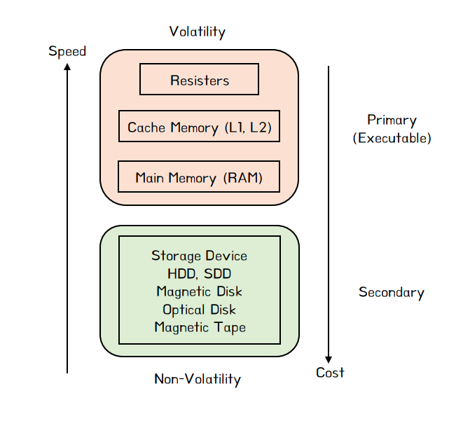 - Cost : 단위공간당 가격을 말한다. 비교적 가격이 높은 주기억장치는 용량이 적지만, 보조기억장치는 용량이 크다.
