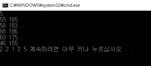 여러분은 입력에 나열된 사람의 덩치 등수를 구해서 그 순서대로 첫 줄에 출력해야 한다. 단, 각 덩치 등수는 공백문자로 분리되어야 한다.